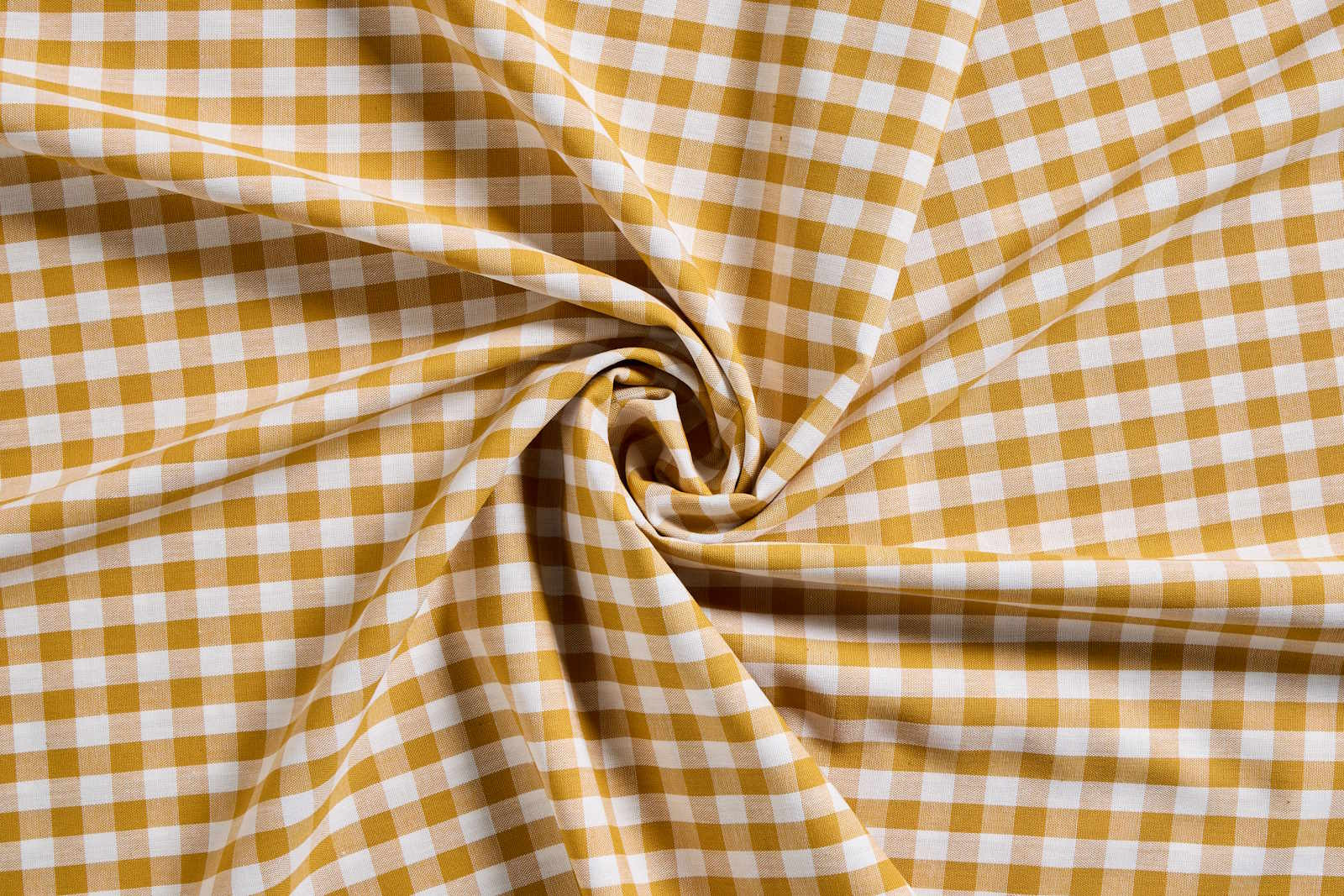 Boerenbont stof in de kleuren okergeel en wit. Deze ruitjes stof is gemaakt van 100% katoen en valt mooi soepel. De ruitjes zijn 10 mm breed. Mooie geweven stof met witte en gele draden. Beide zijden van de stof zijn hetzelfde.