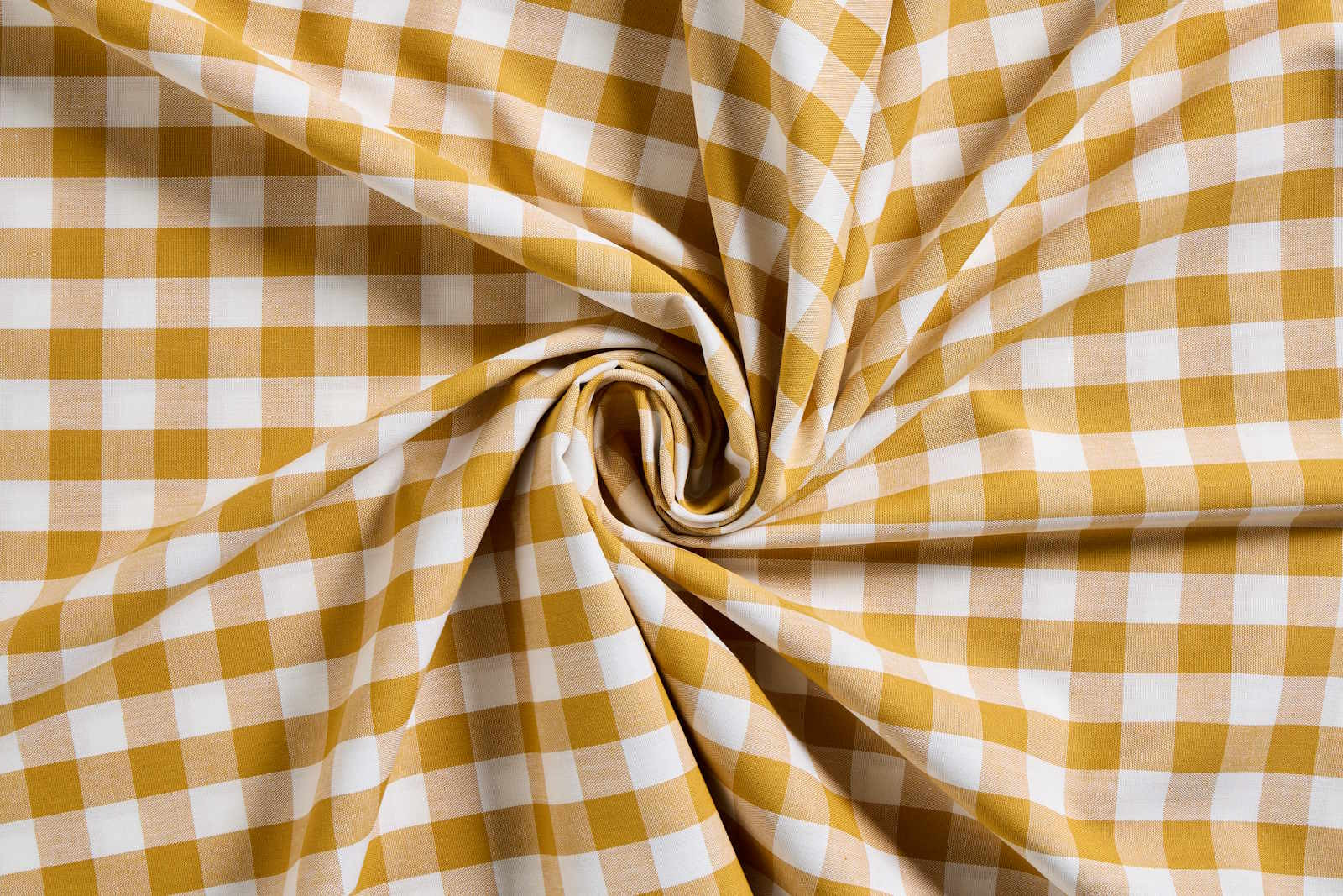 Boerenbont stof in de kleuren okergeel en wit. Deze ruitjes stof is gemaakt van 100% katoen en valt mooi soepel. De ruitjes zijn 20 mm breed. Mooie geweven stof met witte en gele draden. Beide zijden van de stof zijn hetzelfde.