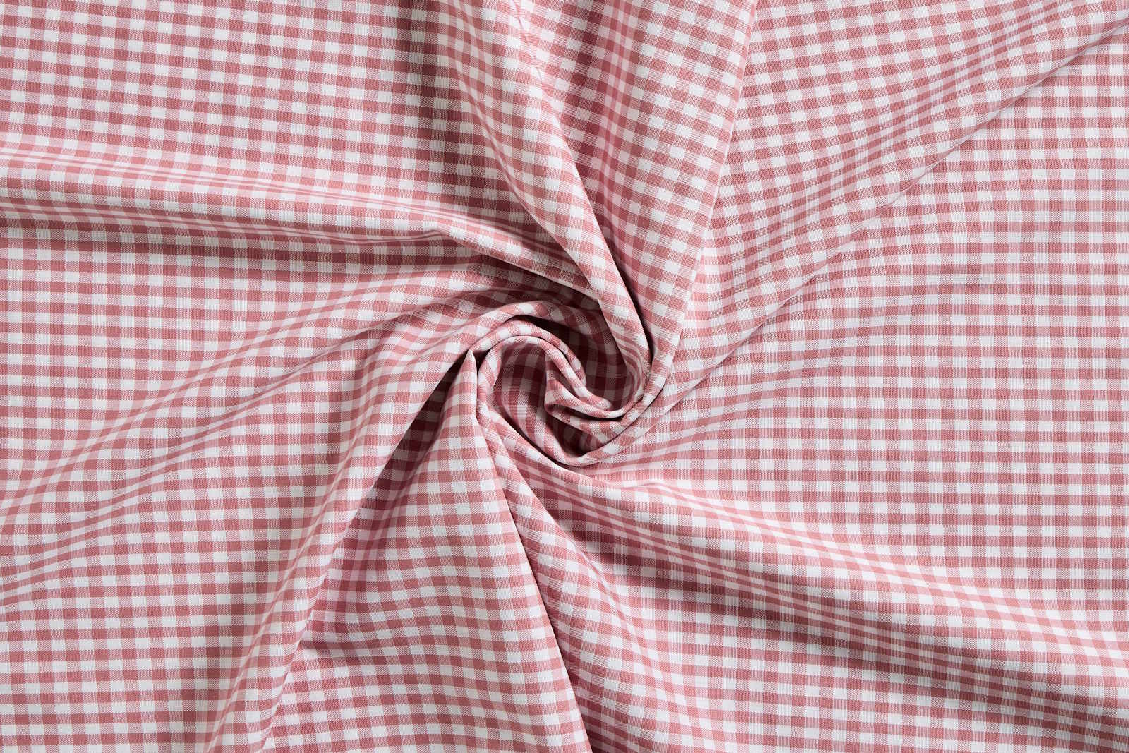 Boerenbont stof in de kleuren oudroze en wit. Deze ruitjes stof is gemaakt van 100% katoen en valt mooi soepel. De ruitjes zijn 5 mm breed. Mooie geweven stof met witte en roze draden. Beide zijden van de stof zijn hetzelfde.