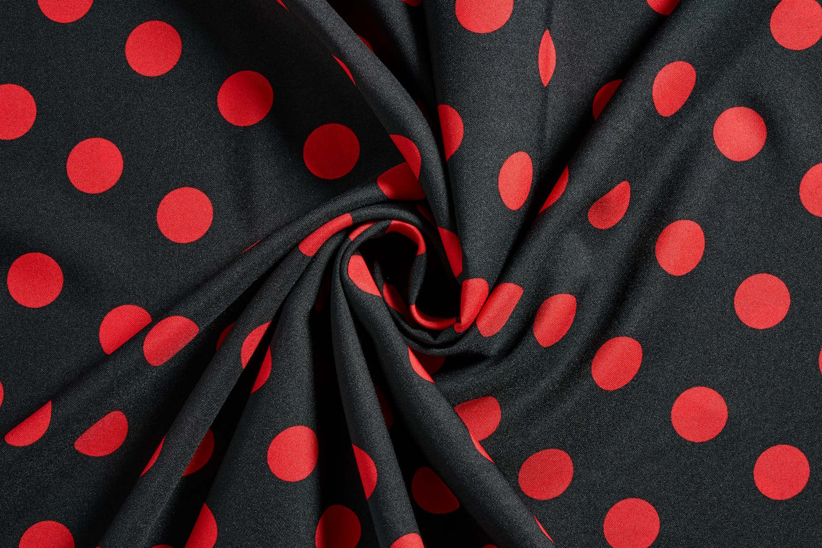 Zwarte Terlenka stof met rode stippen (3 cm). Terlenka is een makkelijk te verwerken stof. De stof is krimpvrij, kreukvrij en kleurecht.