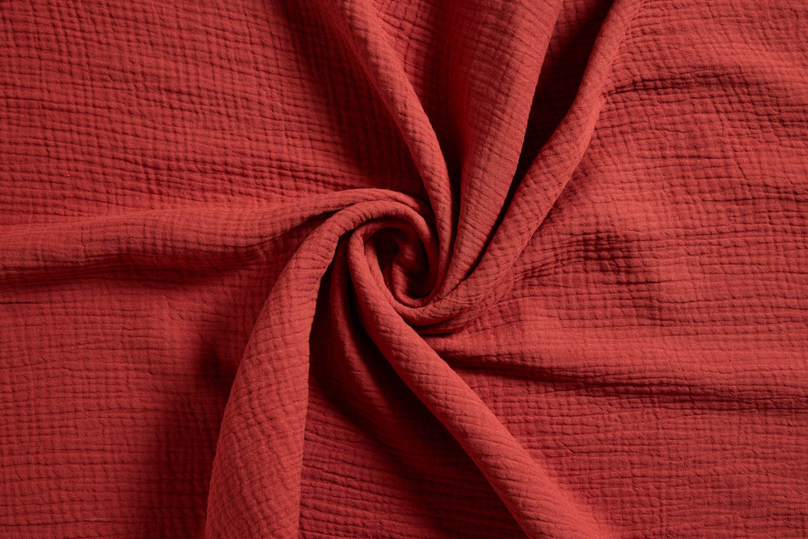 Zeer soepele, zacht aanvoelende mousseline stof in een warme steenrode kleur. Deze stof wordt ook hydrofiel stof genoemd. Gemaakt van 100% katoen, bevat geen stretch en bestaat uit 2 lagen (double gauze).